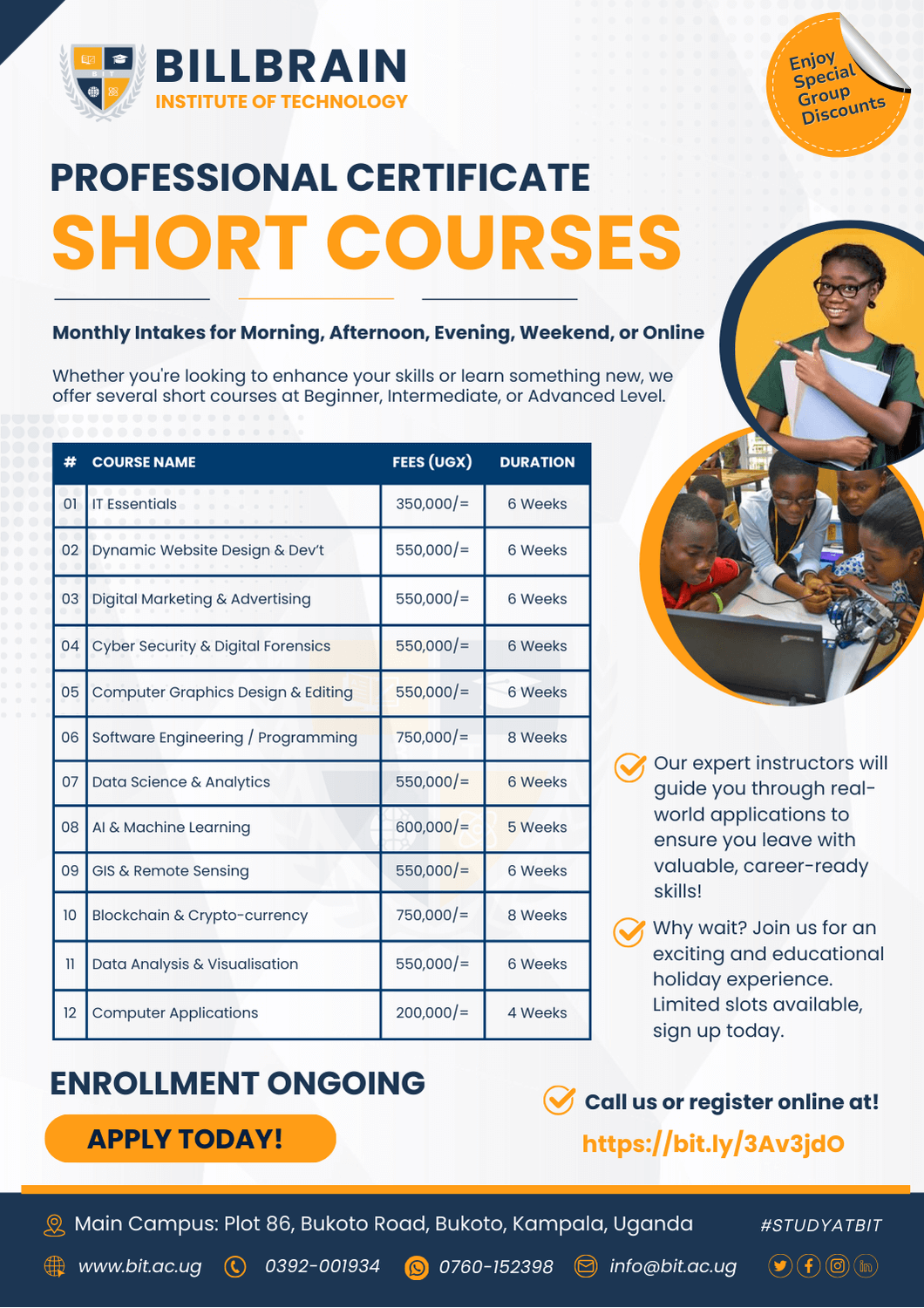 Boost your career with Short Professional Courses at Billbrain Institute of Technology (BIT). Our hands-on courses are designed for beginners, career switchers, and professionals seeking to upgrade their skills in today’s fast-changing digital world.